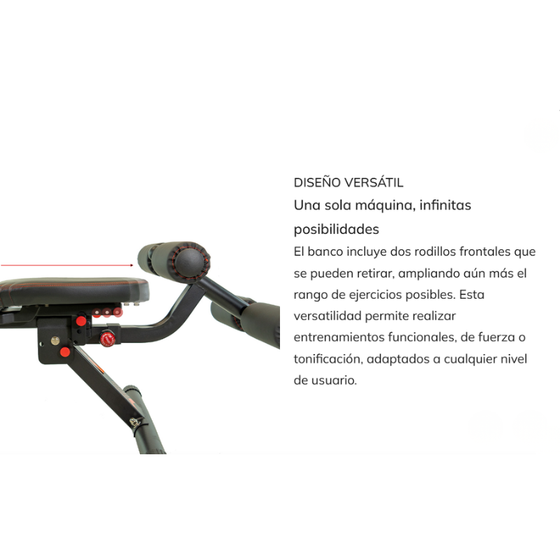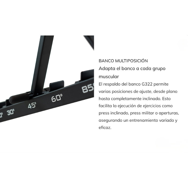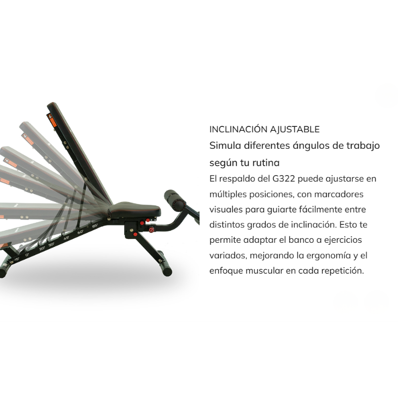 - Respaldo ajustable multiposición para realizar ejercicios en plano, inclinado o declinado.