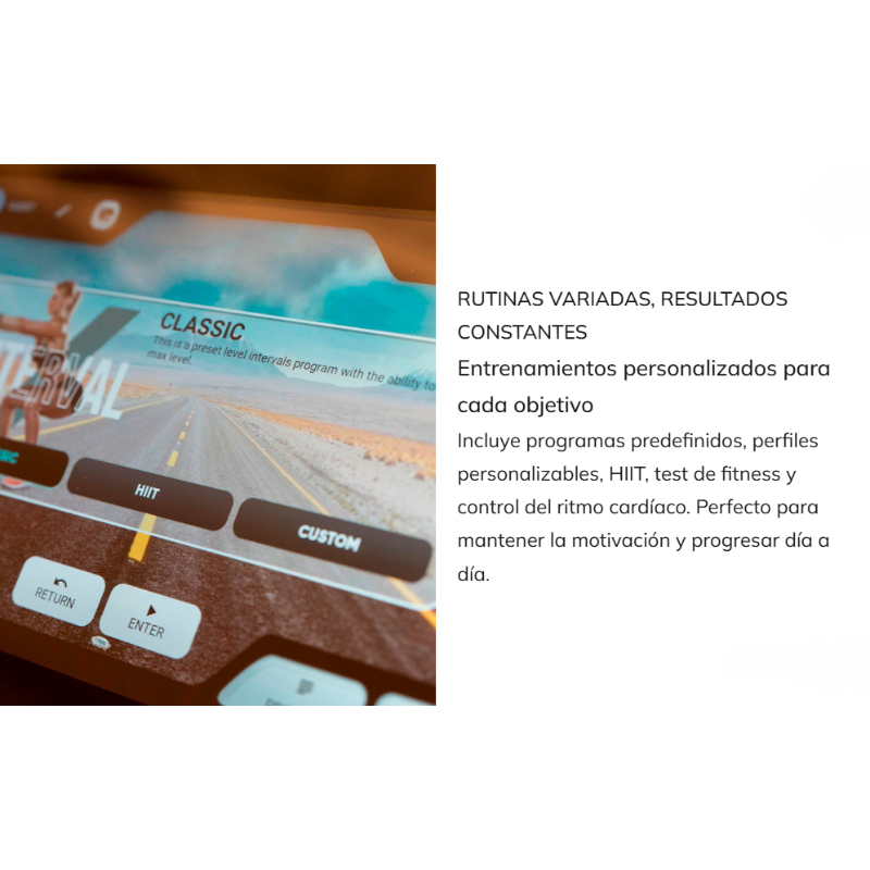 - Pantalla táctil TFT multimedia para entrenamiento interactivo y entretenimiento.