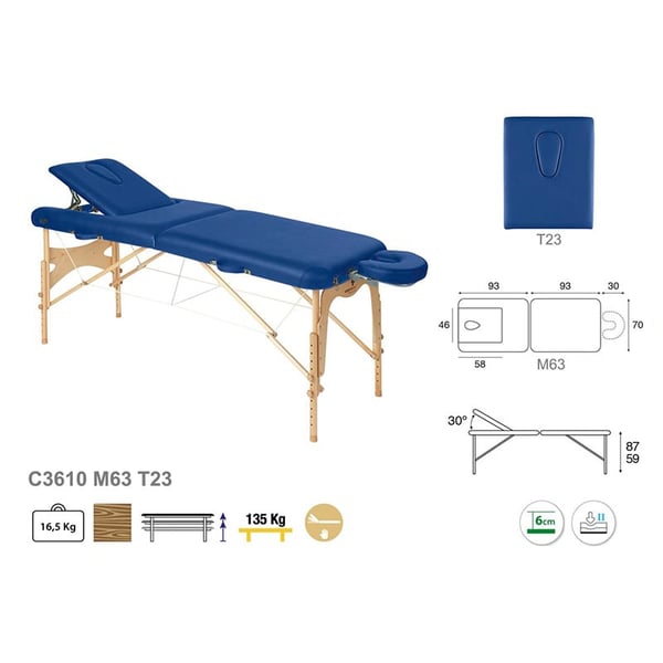 Nueva y versátil camilla plegable Ecopostural de dos cuerpos, ideal para todo tipo de especialidades. Consta de cabecero regulable y una estructura de madera natural.