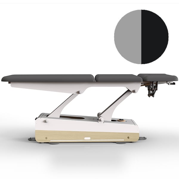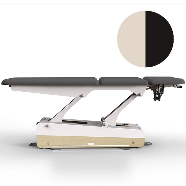 La camilla cuenta con cinco cuerpos y una sección central motorizada, ofreciendo la posibilidad de tratamientos con el paciente completamente tumbado o en posición semi-incorporada. Dispone de colchón calefactable XL, 4 ruedas con giro 360º y sistema de bloqueo/desbloqueo mediante palanca para moverla con facilidad.