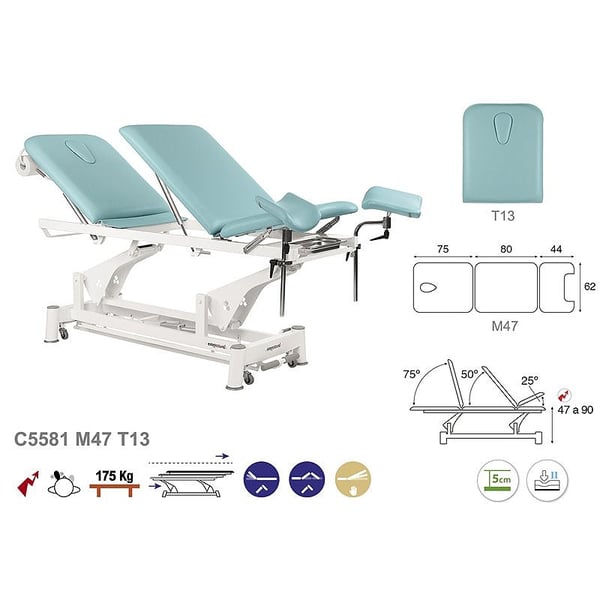 Camilla eléctrica especializada en ginecología y exploración de dos columnas, tres cuerpos y perneras incluidas. Tiene un diseño sencillo, moderno y funcional. Otra de las grandes ventajas que aporta la camilla es su versatilidad ya que resulta ideal para numerosos campos: fisioterapia, osteopatía, medicina general, estética, tatuajes. Una solución perfecta para cualquier profesional de la salud y la estética.