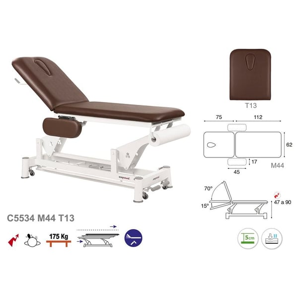 Nueva, moderna y versátil camilla Ecopostural de dos cuerpos con sistema de elevación eléctrico y estructura de biela blanca. Consta de cabezal oscilante, tapón facial, relleno de espuma de varios grados de firmeza y tapizado de clase M2. Asimismo, cuenta con una estructura de acero de bielas con rodamientos y ruedas escamoteables que hacen más fácil el desplazamiento lateral de la misma.
