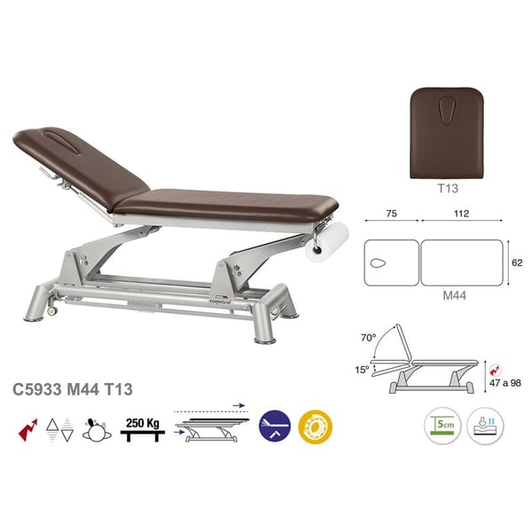 Camilla eléctrica de dos cuerpos y accionamiento periférico Ecopostural. Tiene estructura de dos cuerpos y biela gris. Tiene un diseño sencillo, moderno y funcional. Otra de las grandes ventajas que aporta la camilla es su versatilidad ya que resulta ideal para numerosos campos: fisioterapia, osteopatía, medicina general, estética, tatuajes. Una solución perfecta para cualquier profesional de la salud y la estética.