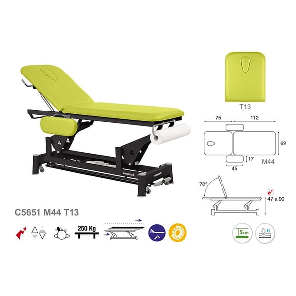 Nueva, moderna y versátil camilla Ecopostural de dos cuerpos con sistema de elevación eléctrico y estructura de biela negra. Consta de brazos abatibles, cabezal oscilante, tapón facial, relleno de espuma de varios grados de firmeza y tapizado de clase M2. Asimismo, cuenta con una estructura de acero de bielas con rodamientos y ruedas escamoteables que hacen más fácil el desplazamiento lateral de la misma.