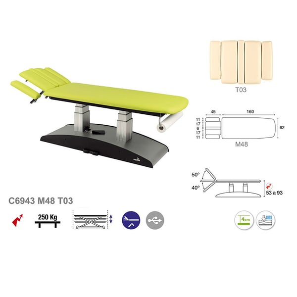 Camilla eléctrica de dos columnas, dos cuerpos y elevación vertical con un cabezal reclinable hasta 90º con portarrollos incluido. Tiene un diseño sencillo, moderno y funcional. Otra de las grandes ventajas que aporta la camilla es su versatilidad ya que resulta ideal para numerosos campos: fisioterapia, osteopatía, medicina general, estética, tatuajes. Una solución perfecta para cualquier profesional de la salud y la estética.