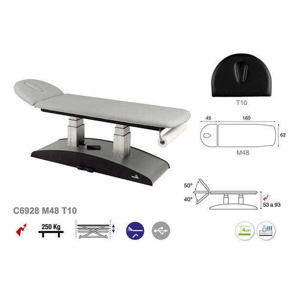 Camilla eléctrica de dos columnas, dos cuerpos y elevación vertical con agujero facial ergonómico incorporado.Tiene un diseño sencillo, moderno y funcional. Otra de las grandes ventajas que aporta la camilla es su versatilidad ya que resulta ideal para numerosos campos: fisioterapia, osteopatía, medicina general, estética, tatuajes. Una solución perfecta para cualquier profesional de la salud y la estética.