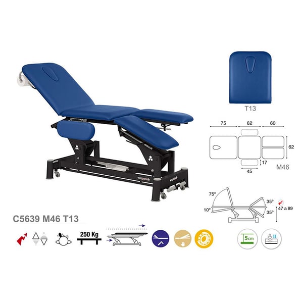 Innovadora camilla eléctrica Ecopostural, de tres cuerpos, ideal para especialidades. Consta de una estructura de acero con ruedas escamoteables y un sistema de elevación eléctrico que hacen que la camilla sea más fácil de desplazar. Además, tiene un cabezal oscilante con tapón facial, brazos abatibles, un relleno de espuma de diferentes grados de grosor y un tapizado de clase M2.