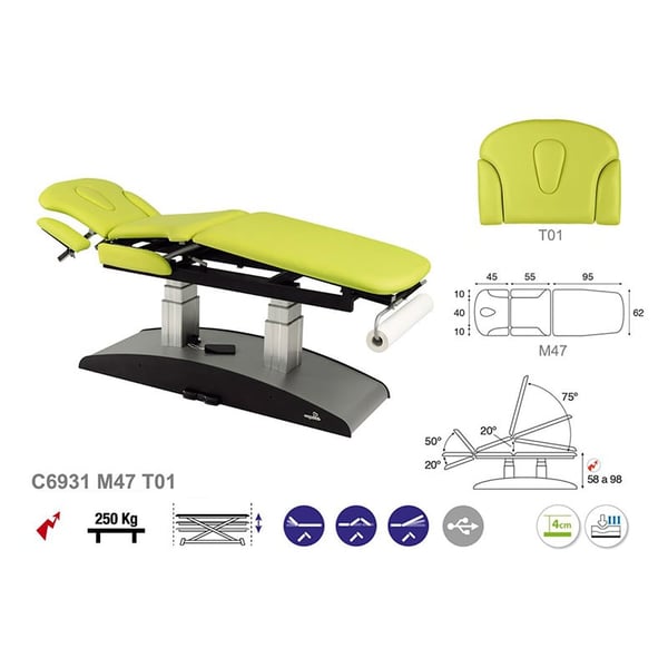 Camilla eléctrica multifuncional de dos columnas, tres cuerpos y elevación vertical con aguero facial incorporado. Tiene un diseño sencillo, moderno y funcional. Otra de las grandes ventajas que aporta la camilla es su versatilidad ya que resulta ideal para numerosos campos: fisioterapia, osteopatía, medicina general, estética, tatuajes. Una solución perfecta para cualquier profesional de la salud y la estética.