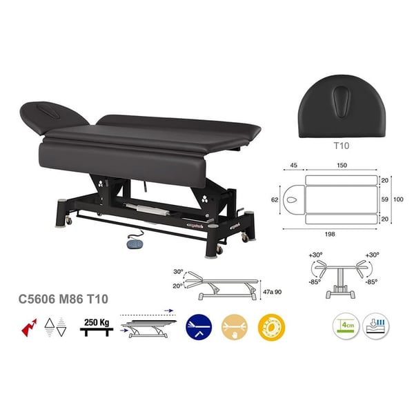 Camilla eléctrica Ecopostural multifuncional: dos cuerpos, tipo Bobath, con brazos abatibles, estructura de biela negra y cabezal T10 (100 x 198 cm)