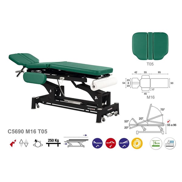 Nueva y versátil camilla eléctrica Ecopostural multifuncional, de tres cuerpos, perfecta para cualquier tipo de tratamiento. Consta de un sistema de elevación eléctrico y una estructura de acero de bielas con rodamientos y ruedas escamoteables que facilitan el desplazamiento lateral de la misma. Asimismo, tiene brazos abatibles, cabezal oscilante y tapón facial para una mayor comodidad. Cuenta también con un relleno de espuma de varios tamaños de grosor y un tapizado de la clase M2.