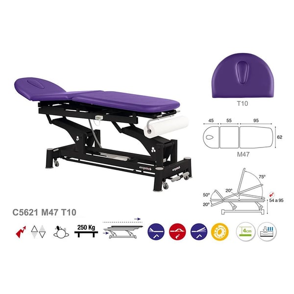 Nueva y versátil camilla eléctrica Ecopostural multifuncional, de tres cuerpos, perfecta para cualquier tipo de tratamiento. Consta de un sistema de elevación eléctrico y una estructura de acero de bielas con rodamientos y ruedas escamoteables que facilitan el desplazamiento lateral de la misma. Asimismo, tiene cabezal oscilante y tapón facial para una mayor comodidad. Cuenta también con un relleno de espuma de varios tamaños de grosor y un tapizado de la clase M2.