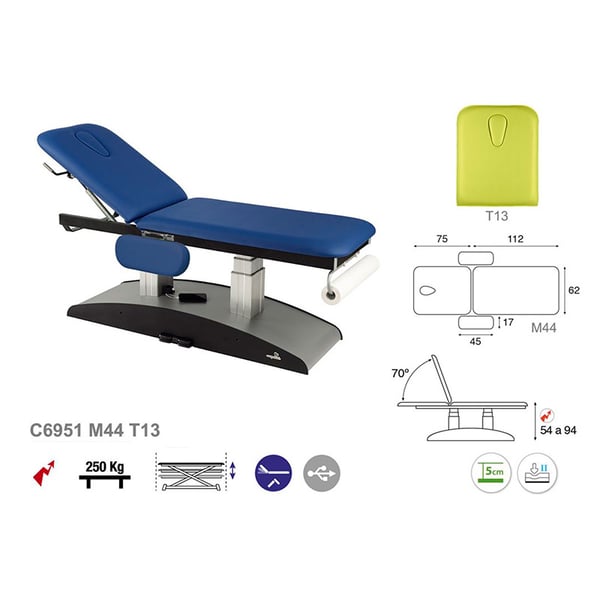 Camilla eléctrica de dos columnas, tres cuerpos y elevación vertical con brazos abatibles y cabezal tipo T04. Tiene un diseño sencillo, moderno y funcional. Otra de las grandes ventajas que aporta la camilla es su versatilidad ya que resulta ideal para numerosos campos: fisioterapia, osteopatía, medicina general, estética, tatuajes. Una solución perfecta para cualquier profesional de la salud y la estética.