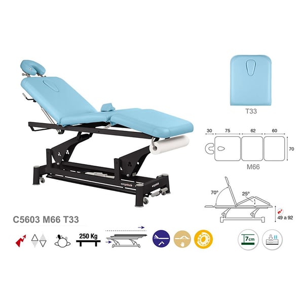 Inédita, ligera y renovada camilla Ecopostural de tres cuerpos con estructura de biela negra y sistema de elevación eléctrico. Está compuesta por un cabezal oscilante, un tapón facial, un relleno de espuma de varios grados de firmeza y tapizado de la clase M2. Además, cuenta con una estructura de acero de bielas con rodamientos y ruedas escamoteables que hacen más sencillo el desplazamiento lateral de la misma.