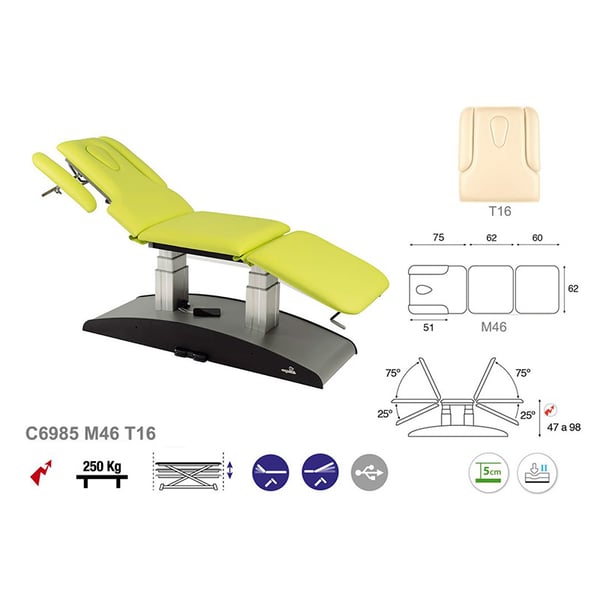 Camilla eléctrica con elevación vertical de dos columnas, dos cuerpos y cabezal inclinable hasta 100º. Además, cuenta con un portarrollos incluido. Tiene un diseño sencillo, moderno y funcional. Otra de las grandes ventajas que aporta la camilla es su versatilidad ya que resulta ideal para numerosos campos: fisioterapia, osteopatía, medicina general, estética, tatuajes. Una solución perfecta para cualquier profesional de la salud y la estética.
