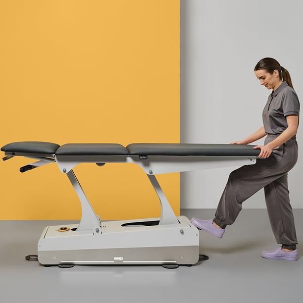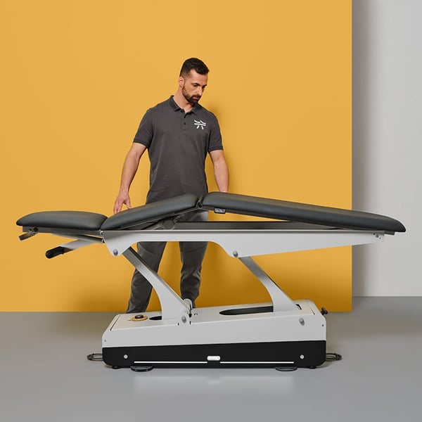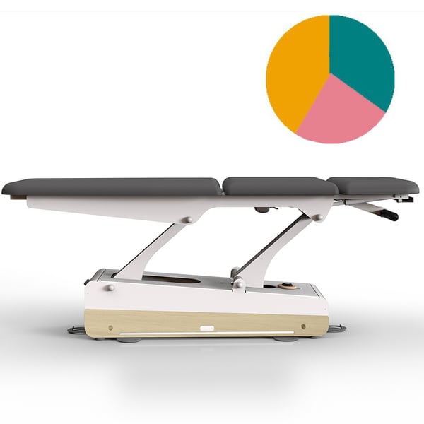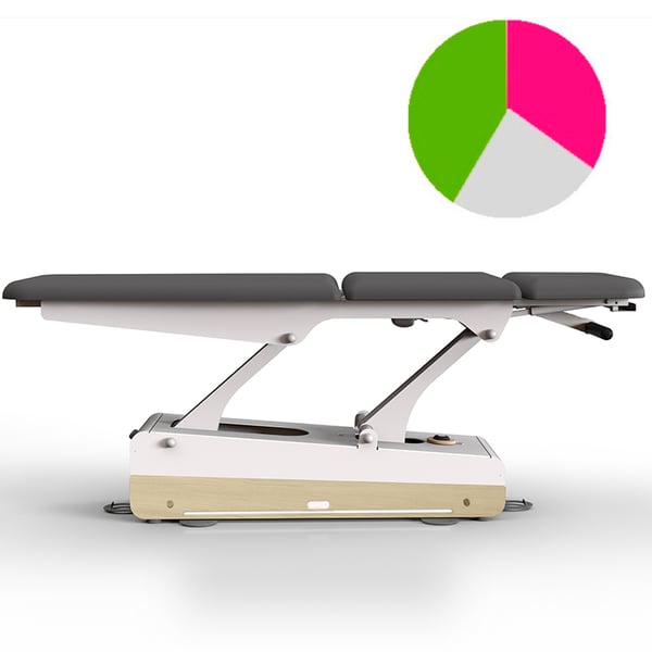 Camilla eléctrica de fisioterapia Swop 3 Pro Physio: tres cuerpos con cabecero corto, sección media motorizada, personalizable, tapizado sin costuras, con doble pistón, un modelo que cambia las reglas del juego