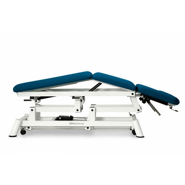 Camilla eléctrica para osteopatía: cinco cuerpos con respaldo reclinable en negativo, reposabrazos regulables, portarrollos, tapón facial y ruedas escamoteables (dos modelos disponibles)