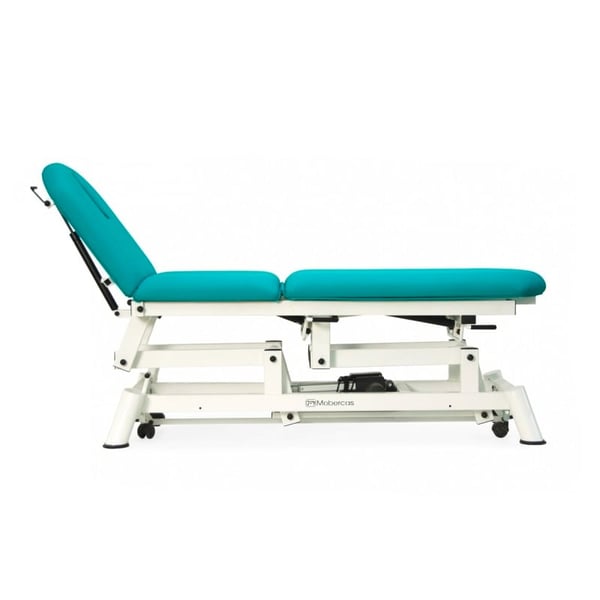 Camilla eléctrica para osteopatía: tres cuerpos, con respaldo reclinable en negativo, portarrollos, tapón facial y ruedas escamoteables