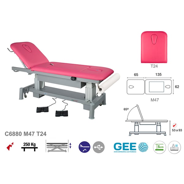 La camilla eléctrica C6880 está diseñada con el objetivo de ofrecer el máximo confort, especialmente para personas con abdomen pronunciado, como mujeres embarazadas. Incorpora un cojín neumático regulable que se adapta perfectamente a la morfología de cada paciente, garantizando comodidad plena en posición decúbito prono. La altura se ajusta fácilmente con un doble mando de pie, optimizando la ergonomía para el profesional. Además, incluye tapones para sus agujeros faciales, lo que permite su uso en diferentes terapias, como fisioterapia, masajes y osteopatía. Con materiales de alta calidad y diseño robusto, es ideal para clínicas de salud y bienestar.