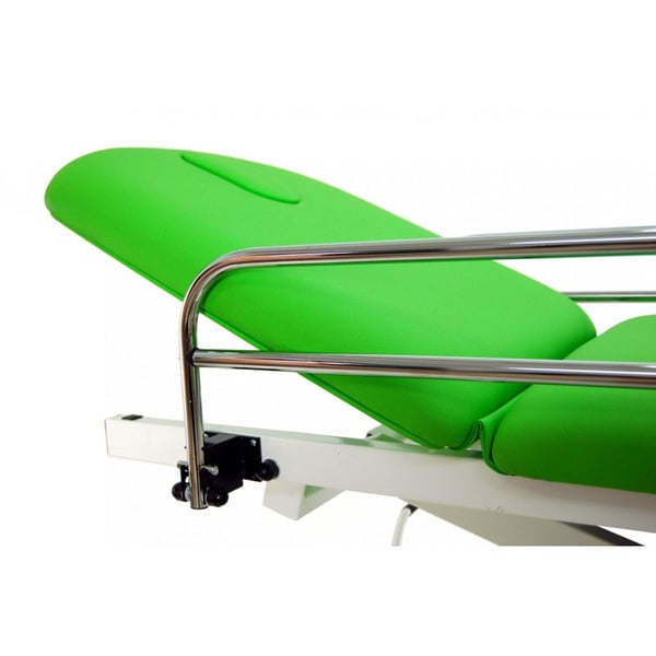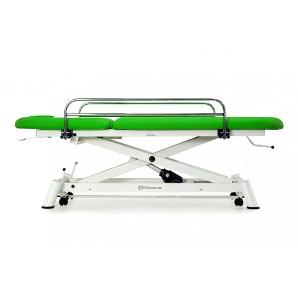 Camilla de reconocimiento eléctrica de dos cuerpos con subida recta sin desplazamiento lateral, con barandillas, portarrollos, tapón facial y ruedas escamoteables.
