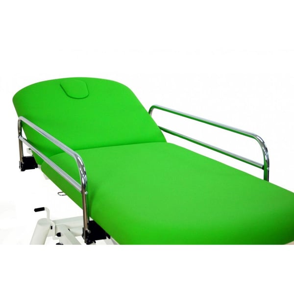 Camilla eléctrica de reconocimiento: dos cuerpos con subida recta sin desplazamiento lateral, barandillas, portarrollos, tapón facial y ruedas escamoteables