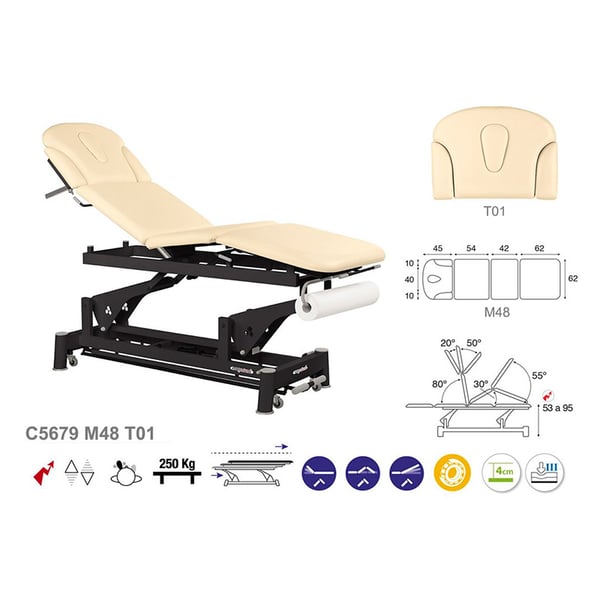 Novedosa camilla eléctrica de modalidad técnica Ecopostural, compuesta de cuatro cuerpos y con un sistema de elevación eléctrico. Consta de una estructura de acero de bielas con rodamientos y ruedas escamoteables que facilitan su desplazamiento lateral. Cuenta con un relleno de espuma de varios niveles de grosor y un tapizado de clase M2. Además, tiene un cabezal basculante que incluye tapón facial que ofrecen un mayor confort para el profesional y el paciente.