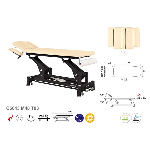 Novedosa camilla eléctrica de modalidad técnica Ecopostural, compuesta de tres cuerpos y con un sistema de elevación eléctrico. Consta de una estructura de acero de bielas con rodamientos y ruedas escamoteables que facilitan su desplazamiento lateral. Cuenta con un relleno de espuma de varios niveles de grosor y un tapizado de clase M2. Además, tiene un cabezal basculante que incluye tapón facial que ofrecen un mayor confort para el profesional y el paciente.