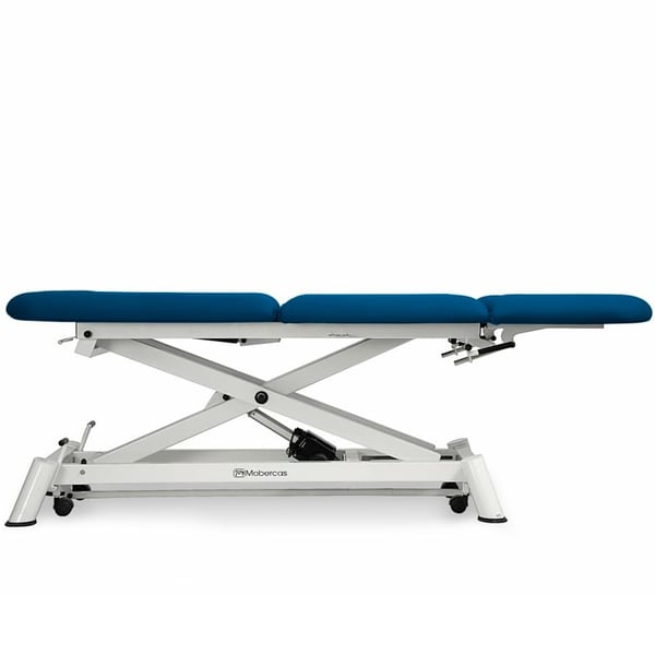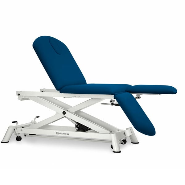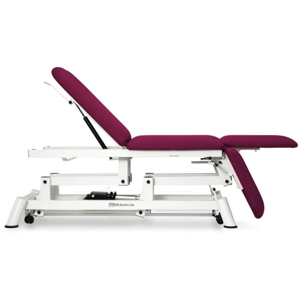 Camilla eléctrica de tres cuerpos, tipo sillón, con regulación en altura, subida recta sin desplazamiento lateral, perneras independientes elevables/reclinables, tapón facial y ruedas escamoteables. Disponible con opción de reposabrazos. Se trata de una camilla especialmente diseñada especialmente para tratamientos de fisioterapia y rehabilitación.