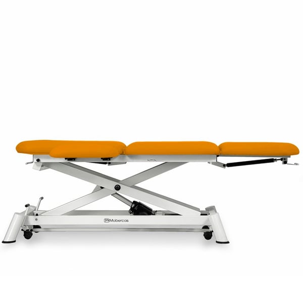 Camilla eléctrica de tres cuerpos, tipo sillón, con regulación en altura, subida recta sin desplazamiento lateral, portarrollos, tapón facial y ruedas escamoteables. Disponible con opción de reposabrazos. Se trata de una camilla especialmente diseñada especialmente para tratamientos de fisioterapia y rehabilitación.