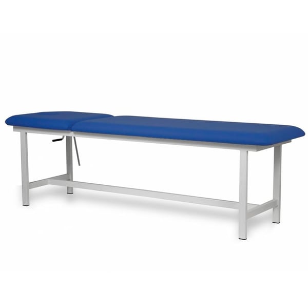 Consta de respaldo reclinable mediante palanca. Se trata de una camilla fija de dos cuerpos con orificio facial. Dispone de una estructura fabricada en tubo de acero y pintada con pintura epoxi cocida a alta temperatura fuerte y muy resistente.