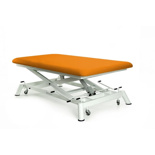 Camilla hidráulica bobath de un cuerpos, tipo tijera, con subida recta sin desplazamiento lateral y con ruedas escamoteables. Dos medidas disponibles: 190cm x 100cm o 200cm x 120cm