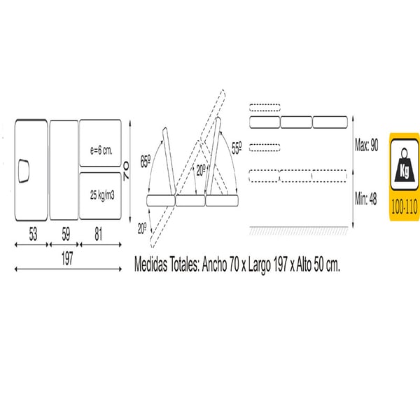- Medidas: 194 cm x 70 cm x (48 - 90cm).