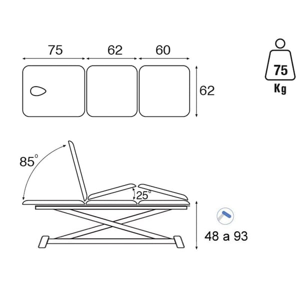 - Cuerpo reclinable mediante resorte a gas (respaldo) y por sistema de cremallera (parte de los pies).