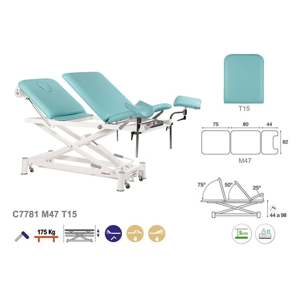 Camilla hidráulica especializada en ginecología y exploración de dos columnas, tres cuerpos y perneras incluidas. Tiene un diseño sencillo, moderno y funcional. Otra de las grandes ventajas que aporta la camilla es su versatilidad ya que resulta ideal para numerosos campos: fisioterapia, osteopatía, medicina general, estética, tatuajes. Una solución perfecta para cualquier profesional de la salud y la estética.