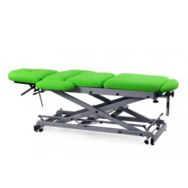 Camilla hidráulica multifuncional para osteopatía: siete cuerpos con regulación de altura motorizada, respaldo reclinable en negativo, pliegue central, brazos y ruedas escamoteables