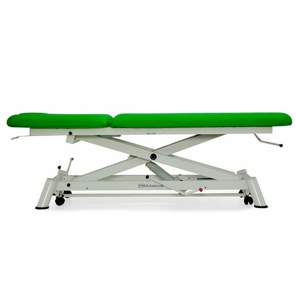 Además, dispone de ruedas escamoteables aptas para trasladar tramos cortos a los pacientes o movilizar la camilla para realizar el tratamiento.