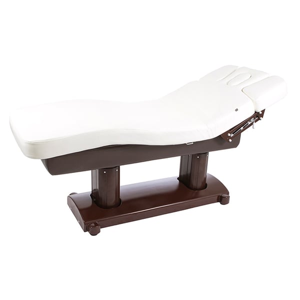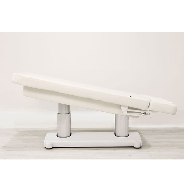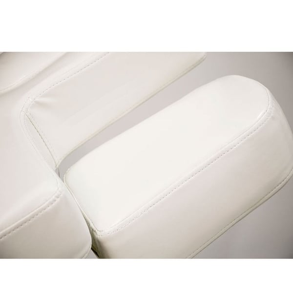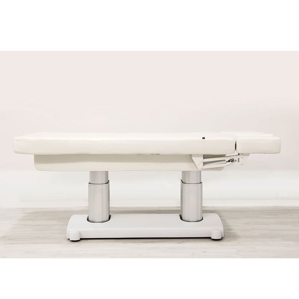 Camilla de SPA de 4 motores que regulan la altura y la inclinación del respaldo, del reposapiés y de toda la camilla. Acolchado de gran confort con tapizado PU blanco de alta calidad. Colchón de una única pieza con 3 secciones. Reposabrazos ajustables y cabezal con agujero facial.