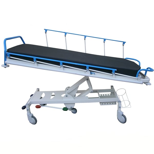 Carro camilla hidráulica de urgencias Kinefis Mercury II, con Tren y Anti-Tren, barandillas abatibles y portasueros telescópico