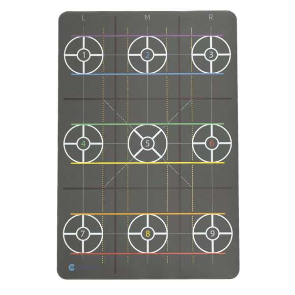 Dividido en 9 cuadrados iguales, numerados del 1 (arriba a la izquierda) al 9 (abajo a la derecha): Cada fila y columna está marcada con líneas de diferentes colores para facilitar la visualización durante los ejercicios.