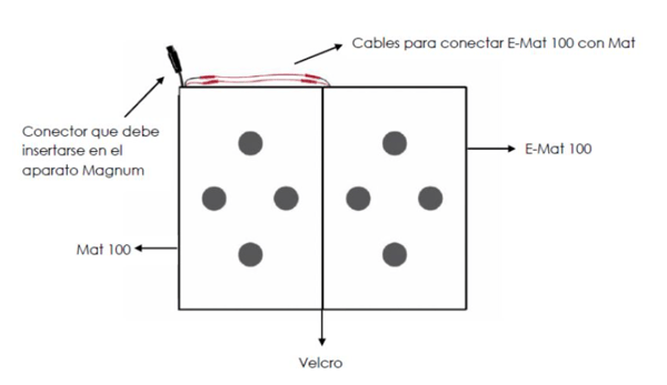 La colchoneta de magnetoterapia E-Mat 100 debe considerarse una extensión de la colchoneta Mat 100, ya que tiene que conectarse con esta a través de dos pequeños cables de conexión.