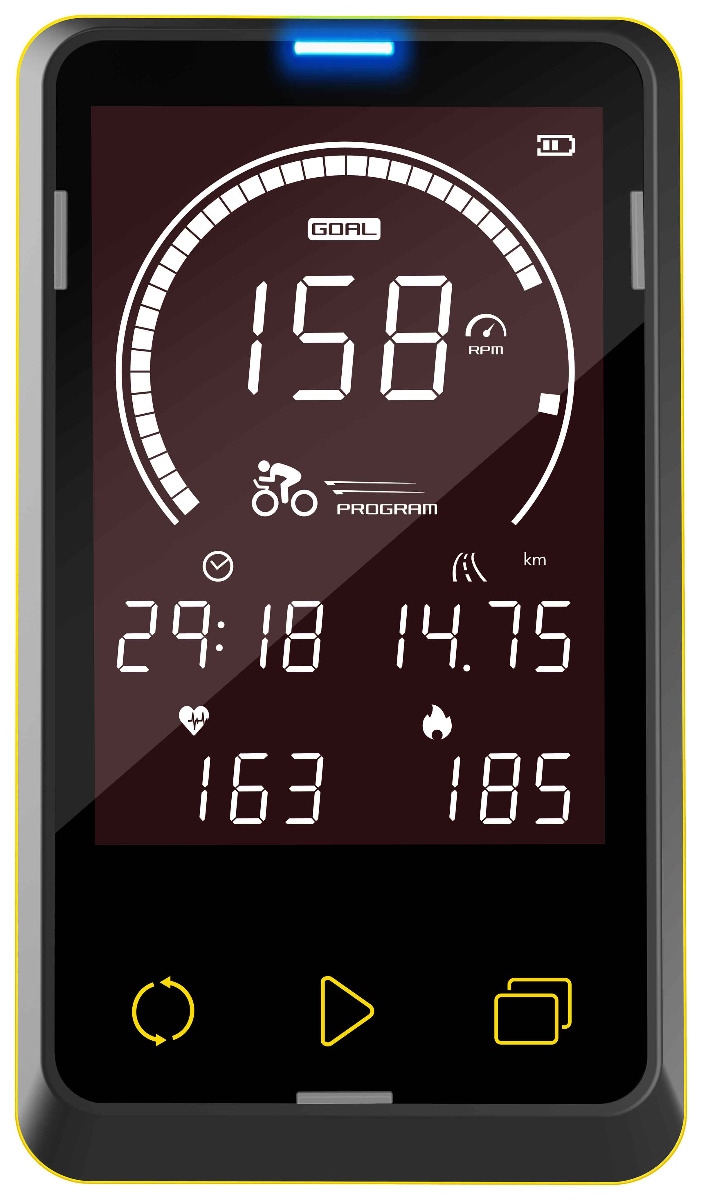 La elegante consola LCD de 5" muestra el tiempo, la distancia, las calorías ritmo cardíaco, RPM, velocidad y nivel de batería. Incluye 3 programas de entrenamiento diferentes, entrenamiento HIIT, de intervalos de velocidad y de intervalos de frecuencia cardíaca. Es además compatible con la tecnología de frecuencia cardíaca inalámbrica de Polar. El sistema Glow Ride. Los indicadores luminosos actúan como un entrenador virtual para mostrarte las tres posiciones del cuerpo que debes adoptar en cada etapa de tu entrenamiento para mantenerte comprometido con el ejercicio.