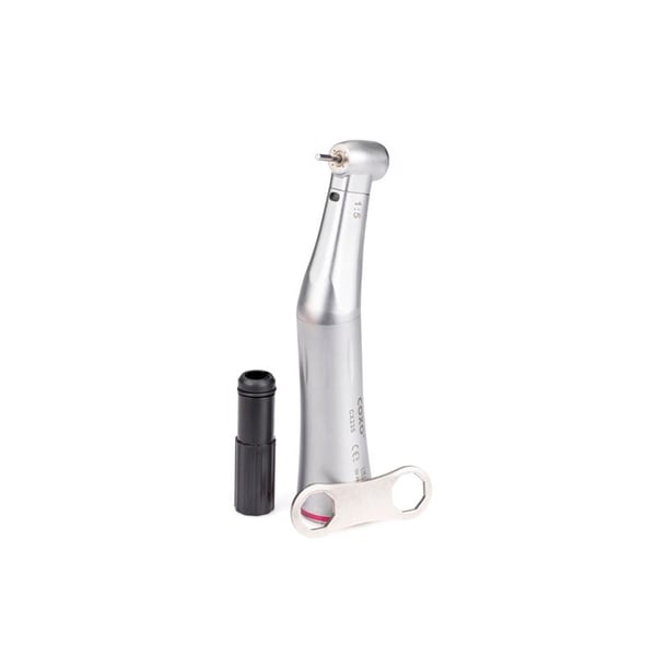 El contraángulo multiplicador 1:5 de Technoflux con luz y fibra óptica es un instrumento rotatorio con spray interno indicado para facilitar la visión de la zona de tratamiento. Es cómodo, práctico y, a la vez, eficiente gracias a su diseño ergonómico. Es fácil de limpiar, además de ser apto para esterilizar un autoclave. Permite el cambio de fresas, que se realiza mediante la presión de un botón. Además, ofrece una velocidad óptima de hasta 220.000 rpm.
