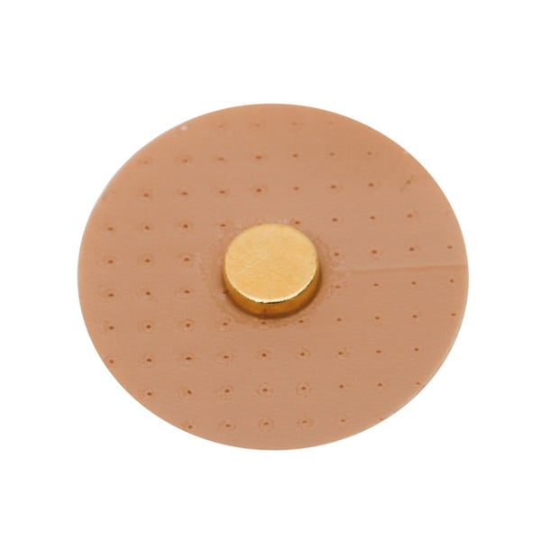 Imanes bañados en oro (6.000 Gaus) sobre adhesivos color beige. Con forma cilíndrica chata. En dirección del cuerpo se encuentra el polo sur.
