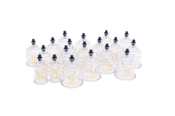 Juego de 19 ventosas, con válvulas magnéticas, pistola y manguera para autoaplicación. Dispone de 5 medidas. Presentado en estuche de metal y polipiel.