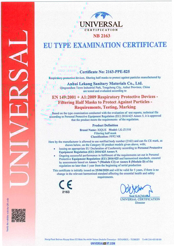 - Testeada y probada su eficacia en laboratorios. Este certificado de cumplimiento se ha otorgado en función de los resultados de las pruebas realizadas en el Centro de Inspección y Supervisión de Calidad de Jiangsu para Productos de Protección de Seguridad Especial acreditados por CNAS (Servicio Nacional de Acreditación de China). La mascarilla cuenta con las disposiciones de las normas específicas de la Unión Europea y cuenta con el certificado EN 149:2001+A1:2009.
