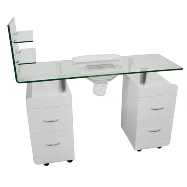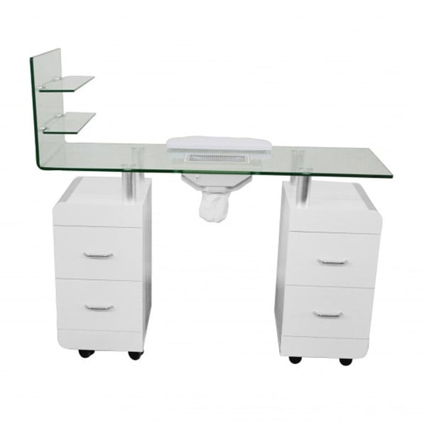 Elegante mesa de manicura de madera contrachapada en blanco con aspirador, bolsa y cojín reposamanos. Encimera y estanterías de cristal templado. Equipada con doble columna con cajones y ruedas incluidas. Incorpora prácticas funcionalidades como aspirador, bolsa y cojín reposamanos.
