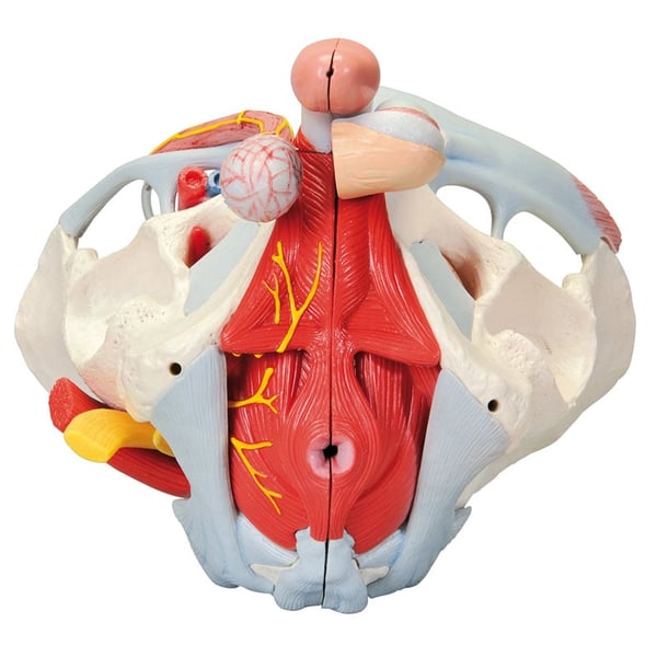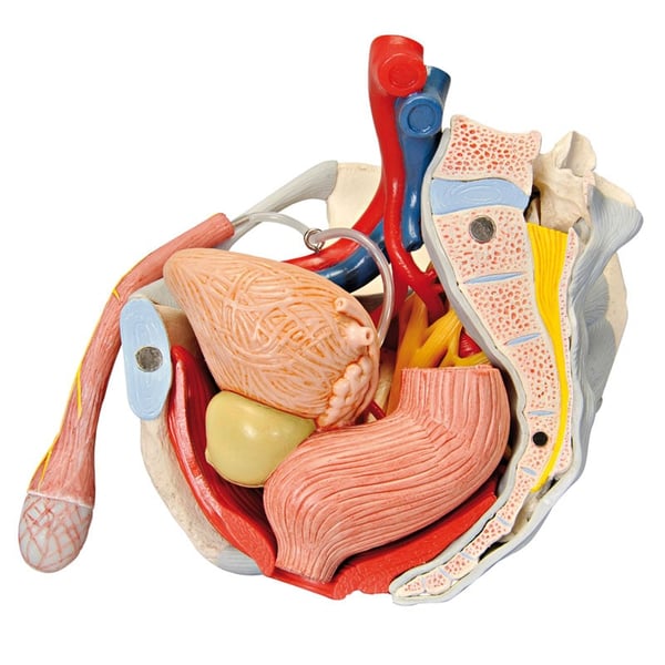 El modelo anatómico de pelvis masculina de siete piezas nos muestra con gran fidelidad de detalles la relación espacial de los huesos, ligamentos, vasos y nervios, así como la musculatura del suelo pélvico y los órganos externos de la pelvis y gónadas masculinas.