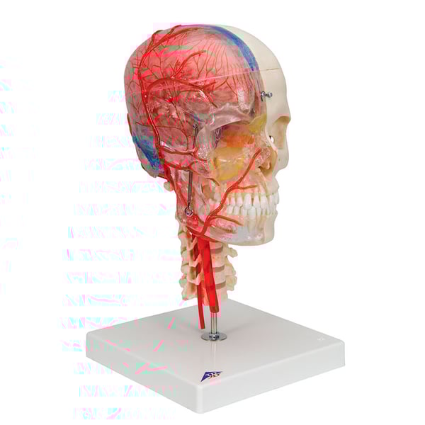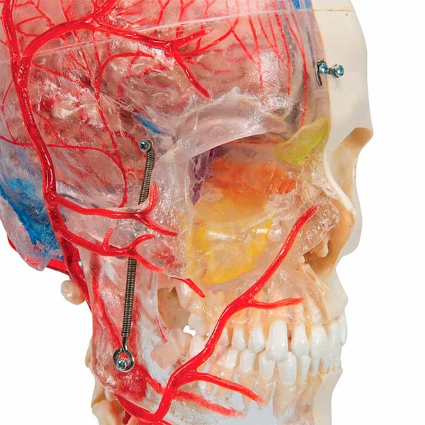 El nuevo modelo de cráneo didáctico de lujo Bonelike aclara todas las dudas anatómicas. Da la posibilidad de conocer estructuras en la mitad transparente del cráneo y los huesos en la mitad ósea.