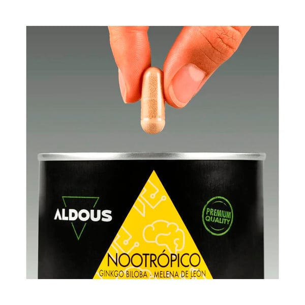 El Nootrópico con Ginkgo Biloba, Melena de León, Cafeína, Bacopa, Tirosina, Teanina y Huperzia Serrata Aldous Bio 80 cápsulas es un complemento alimenticio nootrópico natural diseñado para apoyar la función cognitiva, la memoria, la concentración y el rendimiento mental diario. Su fórmula sinérgica de plantas, aminoácidos y estimulantes naturales potencia la actividad cerebral, favorece la claridad mental y ayuda a mantener un pensamiento enfocado en situaciones de trabajo intenso, estudio o estrés.