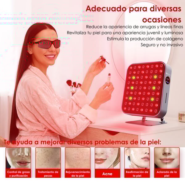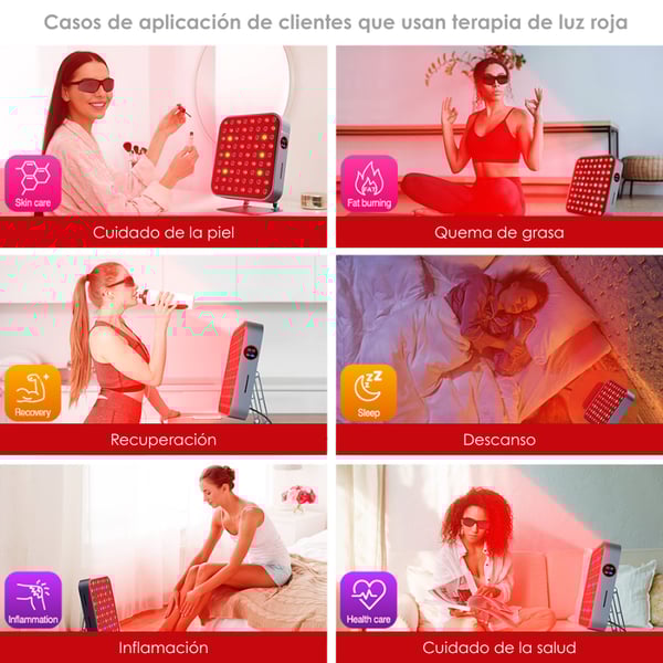- Espectro de longitudes de onda: Combina canales de rojo (≈630 nm + 660 nm), infrarrojo cercano (≈810 nm + 830 nm + 850 nm) y posiblemente otras longitudes para aplicaciones de luz terapéutica amplia.