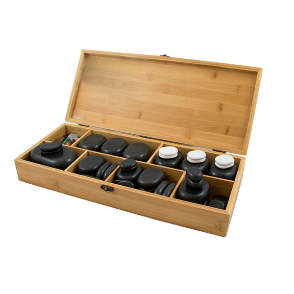 Se basa en la acupuntura y el uso de las líneas de los meridianos, puede ayudar a mejorar la circulación. Las piedras de basalto se mantienen calientes durante mucho tiempo, son ideales para el masaje de la espalda y del cuello, y, en este caso, son presentadas en una elegante caja de madera.